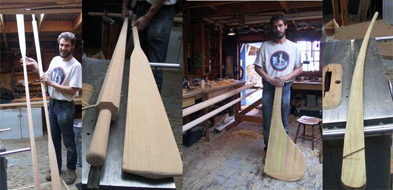 Anton shows off a pair of stylish fir oars, rudder, tiller and mast with sprite in the background.