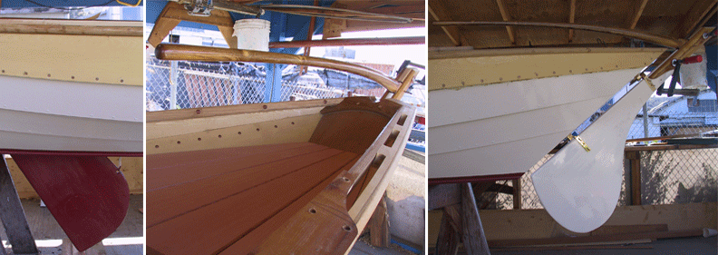 Things are really begining to come together. The centerboard has been installed (left), the interior seats are in place (center), and the graceful tiller and the rudder ensemble is ready for action (right).