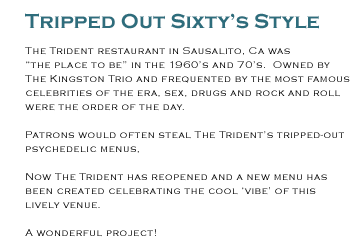 The new Trident menu has been made into beautiful 18" x 24" framable poster art, so you don't have to steal them anymore! $15.00 includes shipping and handling.